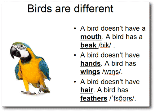 • A bird doesn’t have a mouth. A bird has a beak /bik/.