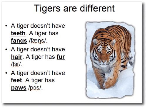 • A tiger doesn’t have teeth. A tiger has fangs /fæŋs/.