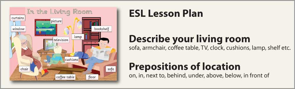 At this point, the teacher might want to review prepositions of place (in, on, next to, in front of, behind, above, below etc.) and go through the pronunciation of the living room items.