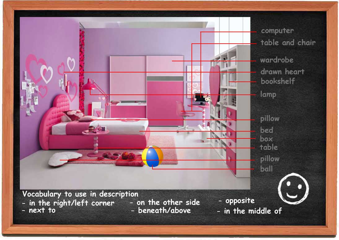 The students draw their own bedrooms and write the description. Having the bedroom drawn makes correction easier for the teacher (seeing the drawing, the teacher knows what should be written in the description).
