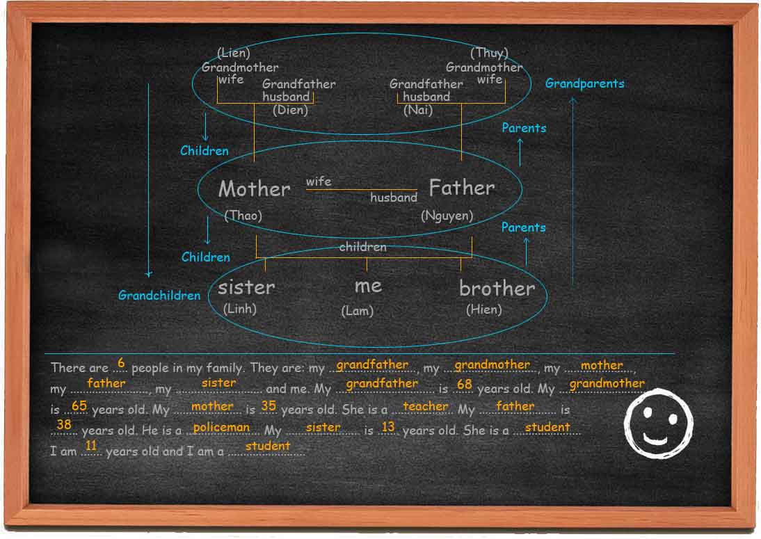 In order to describe their family, the students have to know the members of their families. The teacher chooses a student from the class and by asking questions, the teacher draw on the board the family tree of the student.