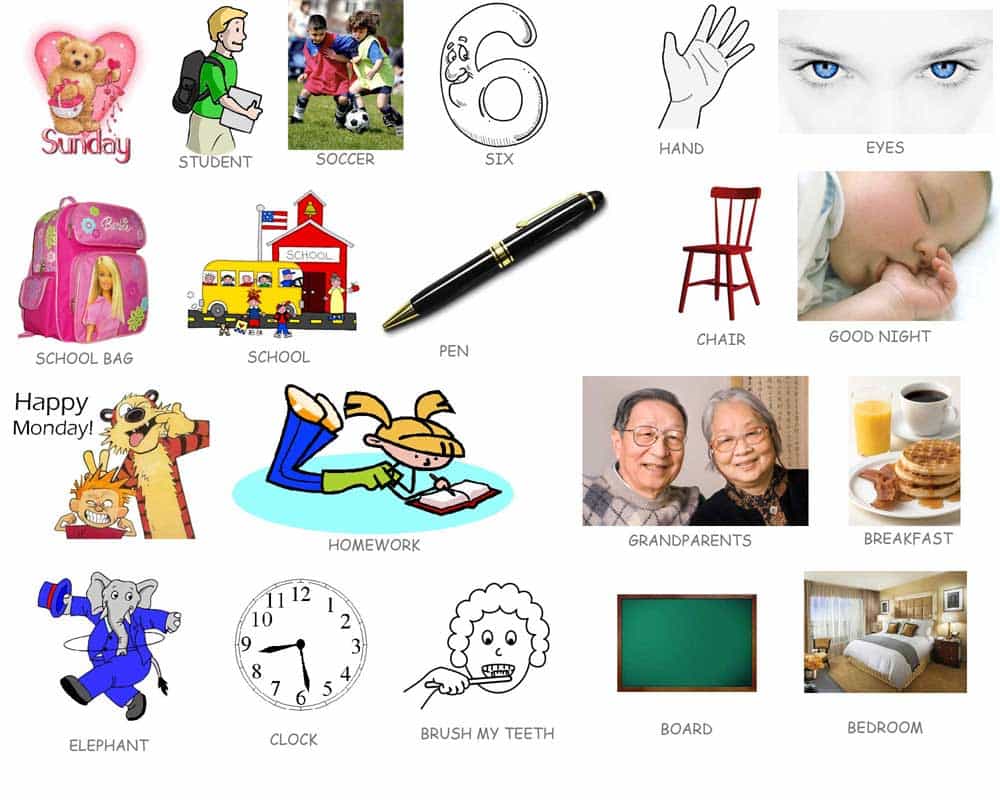 Mine, it’s a big picture containing 21 smaller pictures (the teacher can also use individual pictures). The lesson flows as a big guessing game. The vocabulary from the picture can be reviewed at the beginning of the lesson if that is necessary.