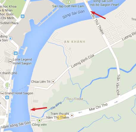 You can get there either through the underground passage (down left on the map – Ham Song Sai Gon) or from the other side, the Thu Thiem bridge (up right on the map – cau Thu Thiem).