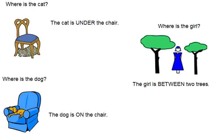 Introduce the different prepositions by drawing a small sketch to explain. Ask the students to repeat and write down in their notebooks.