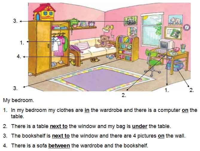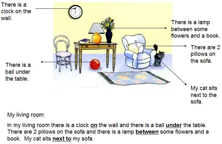 Provide simple sentences to illustrate how to use prepositions to describe one’s house. Ask the students to write 4 sentences to describe a room in their house.