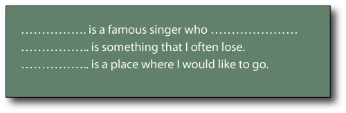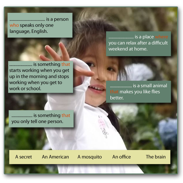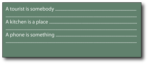 In pairs or small groups ask students to think of a definition of the following words and write them in the notebooks: a mosquito, a secret, the brain, an American, and an office.